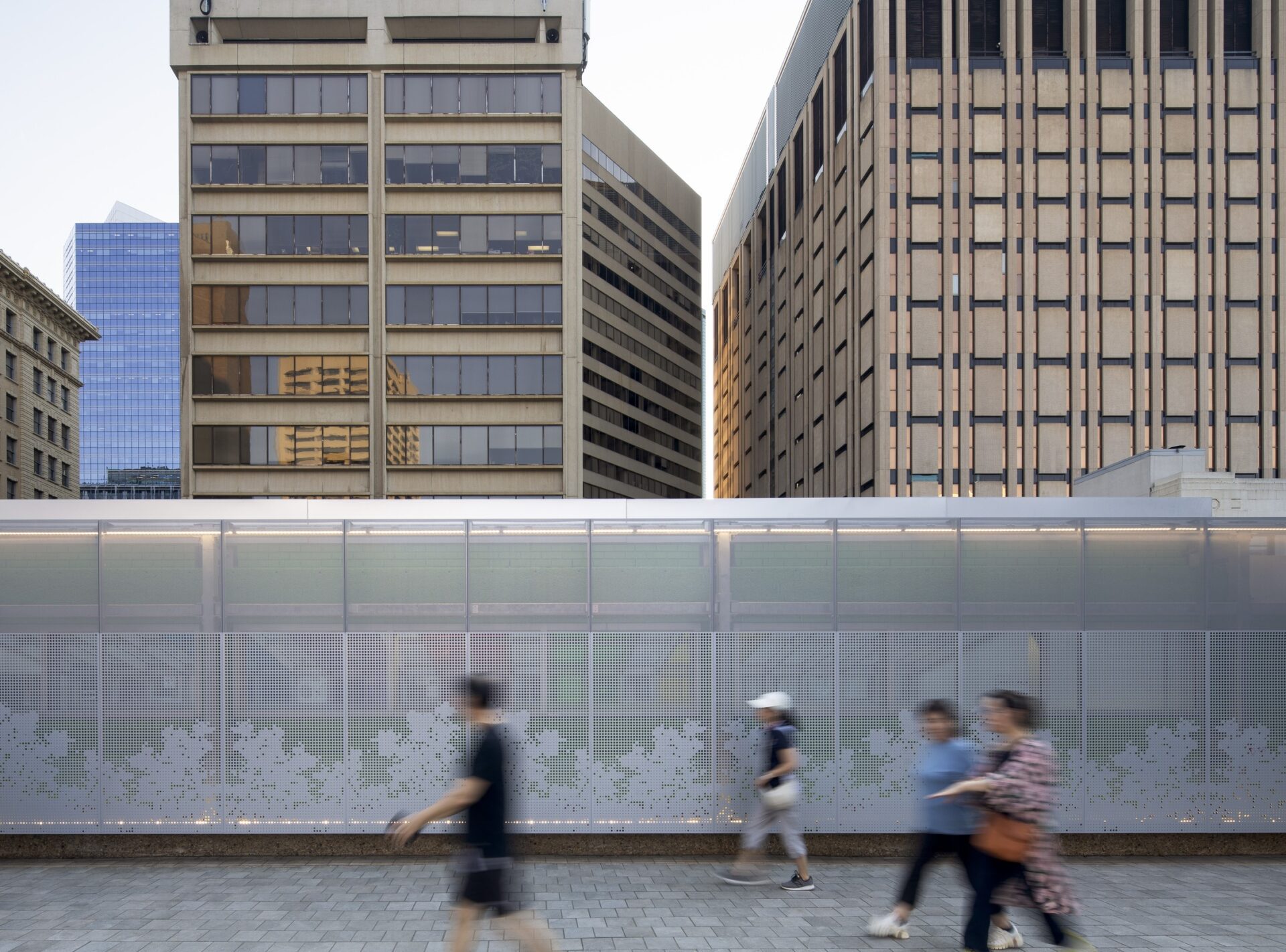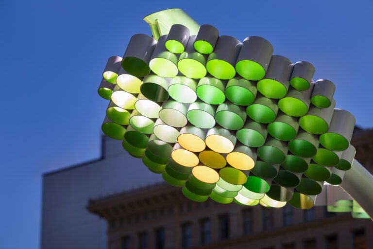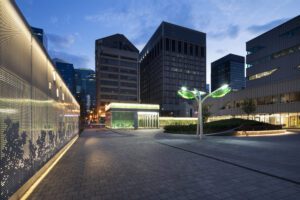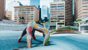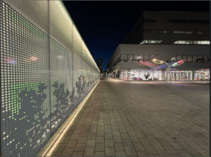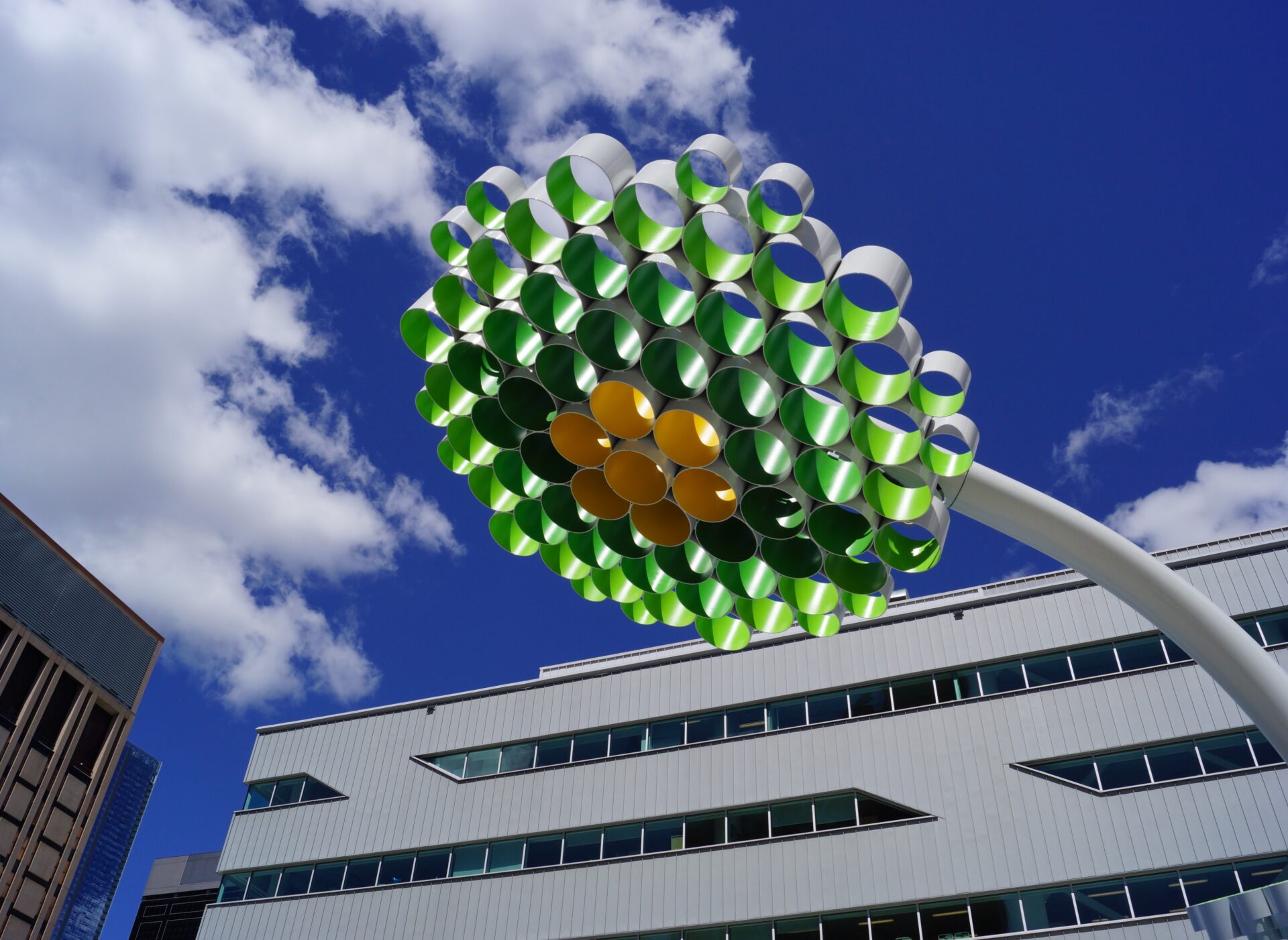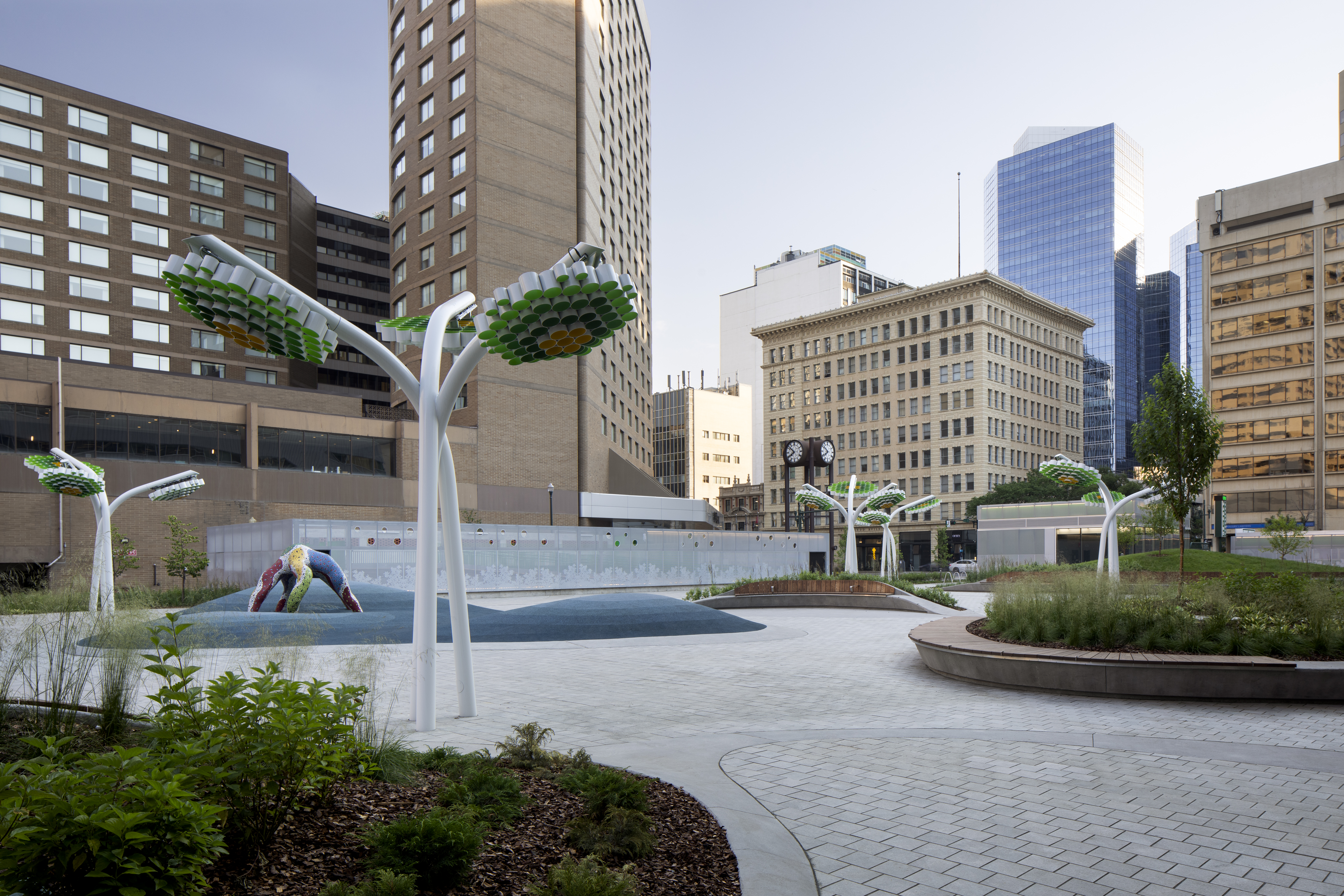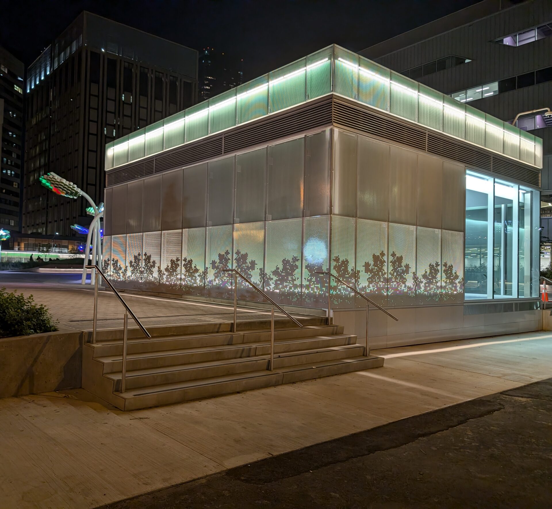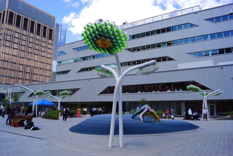 A stunning outdoor art installation featuring illuminated flower sculptures and the back lit ocular fence at the Centennial Plaza by the Stanley Milner Edmonton Public Library. This project transforms the space into a vibrant, creative, and inspiring urban oasis.